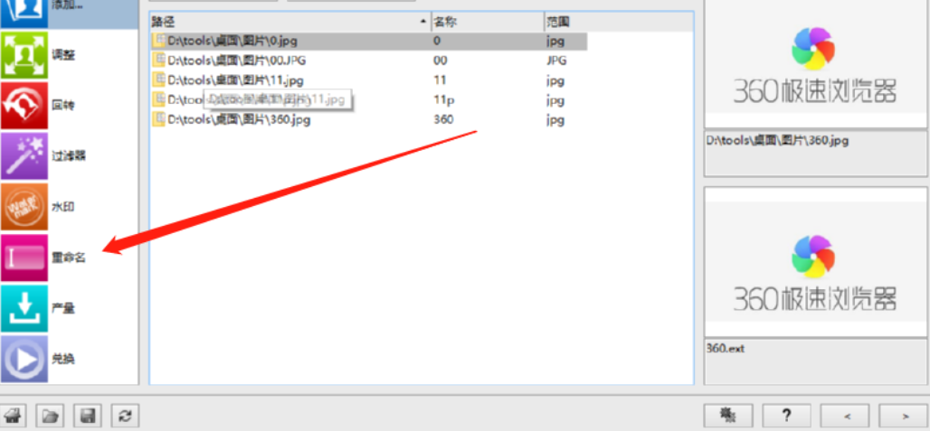 3.点击打开按钮之后我们就可以在界面中看到添加进来的图像文件了,然后我们点击左边的重命名这个功能选项,切换到重命名功能界面。