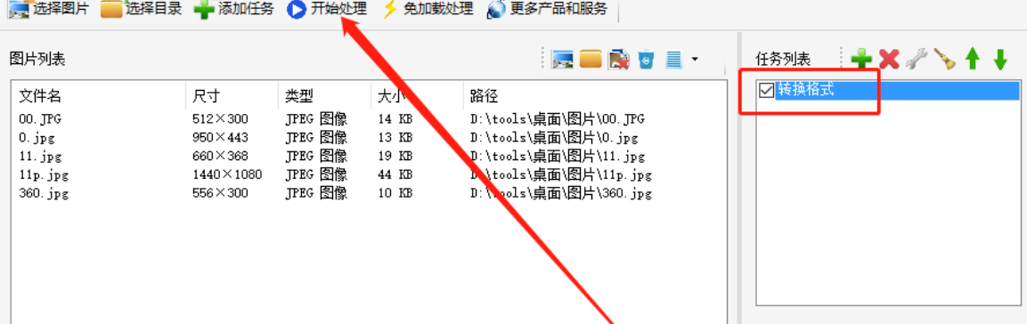 6.点击确定按钮之后这个转换格式的任务就添加完成了,然后我们点击界面上方的开始处理按钮即可开始批量转换这些图片。