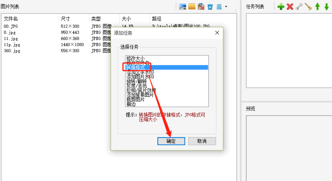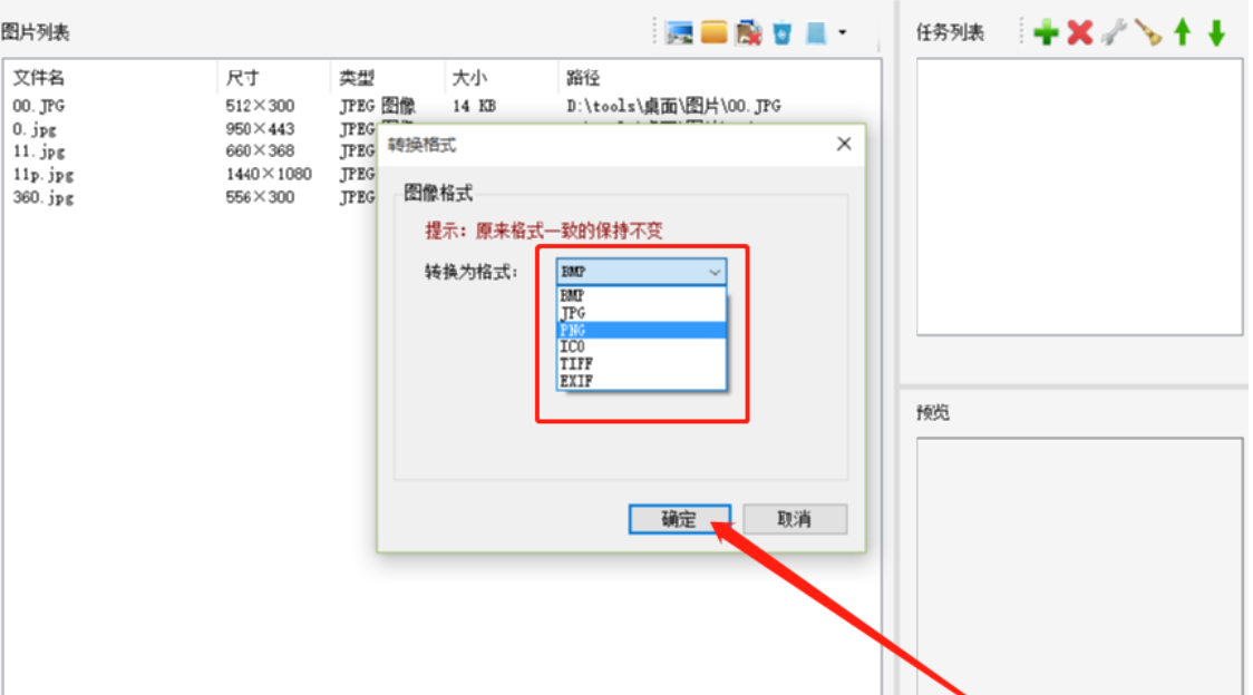 5.打开转换格式的功能之后,我们点击选择格式的下拉列表,在其中选择想要转换成什么格式的图片文件,选择之后点击确定按钮即可。