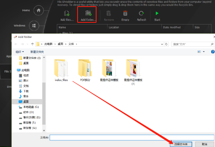 4.另外我们还可以添加想要粉碎的文件夹,点击Add folder这个添加文件夹按钮之后在出现的界面中选择想要粉碎的文件夹即可。