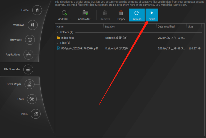 5.选择好想要粉碎的文件或者是文件夹之后,点击界面右上方的Start这个开始按钮我们就可以开始粉碎文件的操作了。