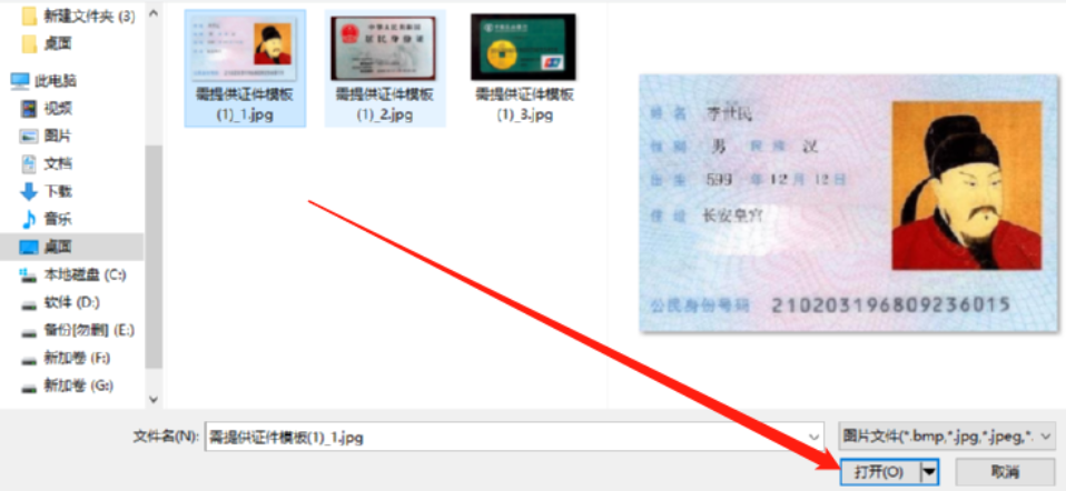 2.点击添加文件按钮之后,我们在出现的界面中选择想要识别的身份证正面的图片,选中之后点击打开按钮即可。