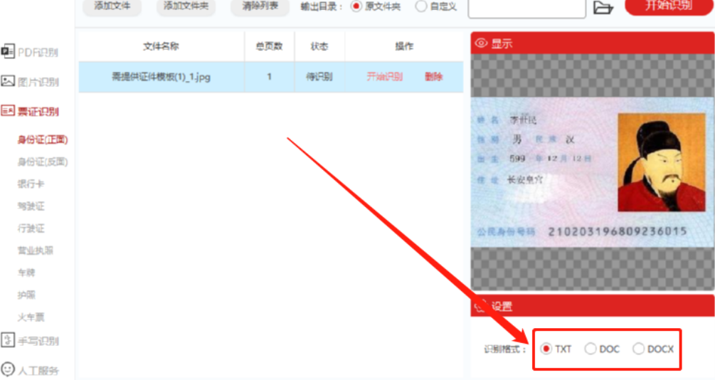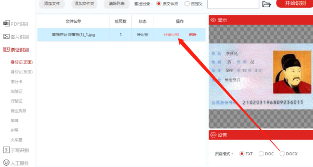 4.选择好文件保存格式之后下一步我们点击界面操作模块的开始识别按钮就可以开始识别这个身份证图片中的信息了。