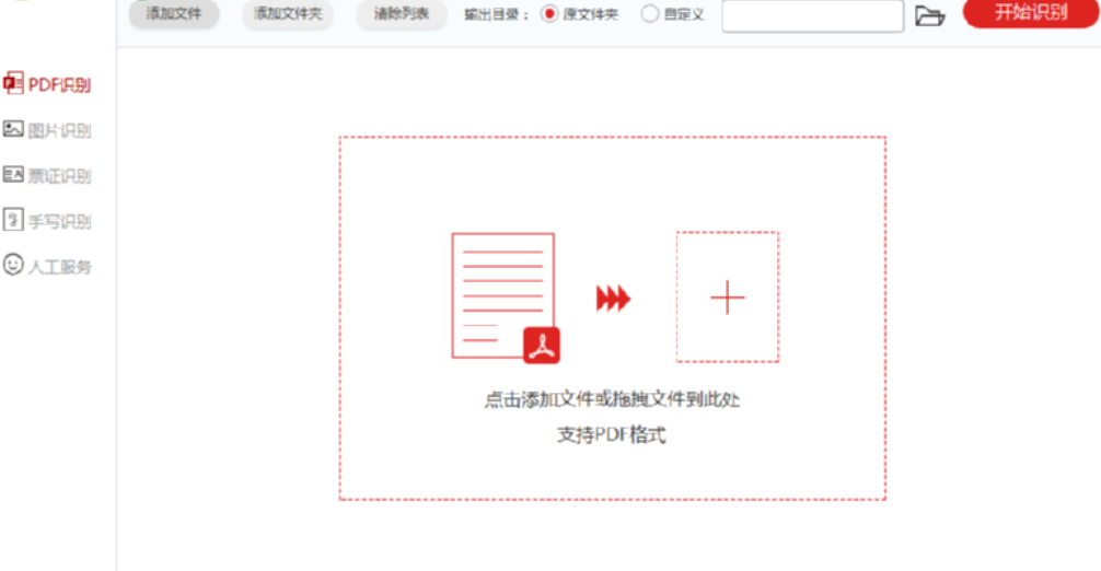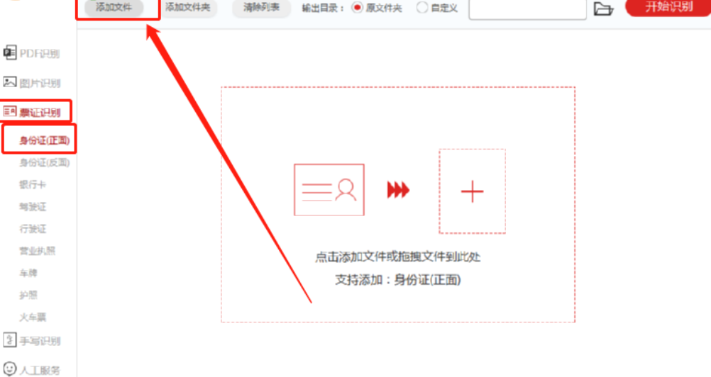 1.首先第一步我们打开软件之后打开票证识别功能,点击选中身份证(正面)这个功能之后,点击添加文件按钮。