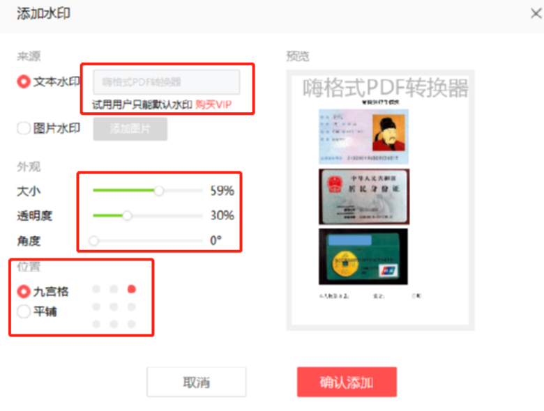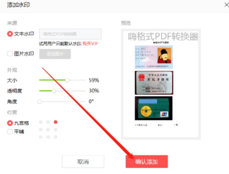 7.在软件中自定义水印内容是需要购买软件VIP的,有需要的朋友自行购买之后完成对水印的样式设置,最后点击确认添加按钮就可以开始添加水印的操作了。