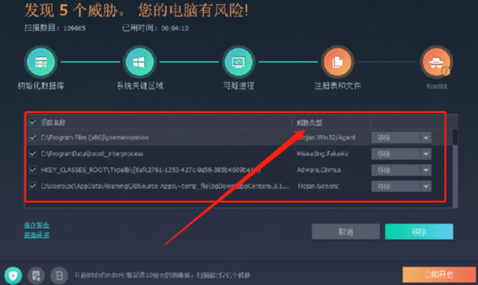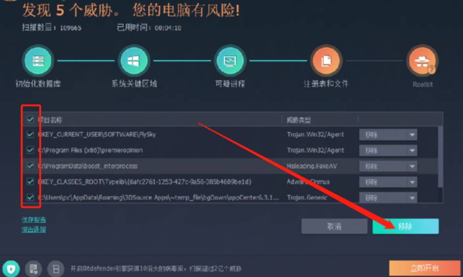4.紧接着我们找到这些威胁程序选项,全部勾选之后点击界面右下角的移除按钮即可开始清理这些扫描出来的恶意程序。