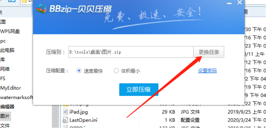 2.点击添加功能按钮之后会出现一个添加压缩任务的界面,我们点击界面中的更换目录按钮可以更换文件压缩输出的路径。