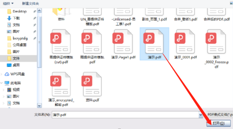 2.点击添加文件按钮之后下一步在出现的选项中点击选中目标PDF文件,然后点击界面右下角的打开按钮。