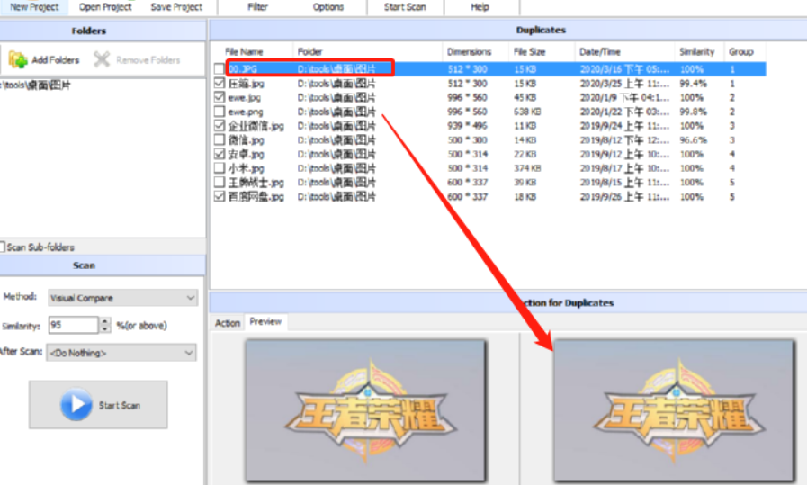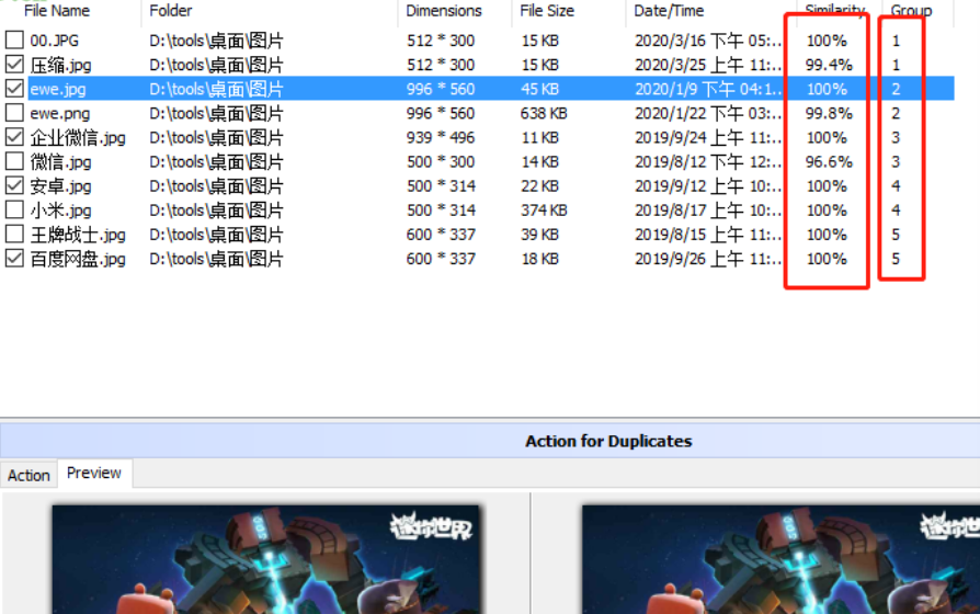 5.我们在扫描出来的重复图片列表中可以看到相同的一组图片被分配到一个组当中,并且还显示了他们的相似度。