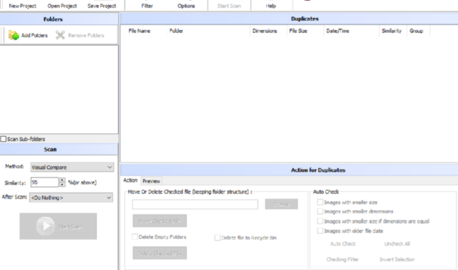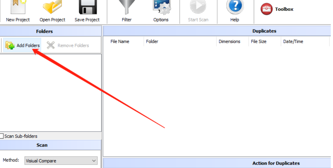 1.首先第一步我们打开软件之后在软件界面的左边点击Add Folder这个添加文件夹按钮,点击之后即可添加扫描重复图片的位置。