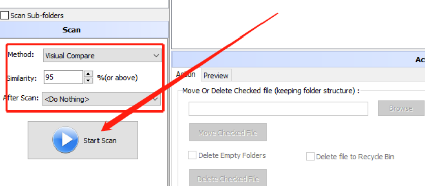 3.点击确定按钮之后下一步我们在界面左下角可以设置对比重复文件的规则以及设置相似度百分比,根据需求设置完成之后点击Start Scan按钮开始扫描。