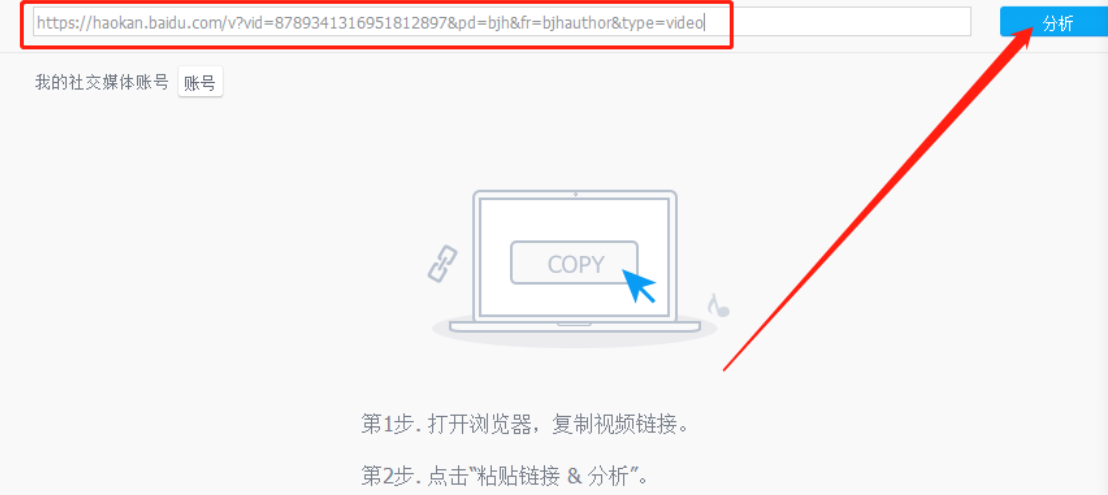 3.点击添加视频之后下一步就是在出现的界面中粘贴想要下载视频的网页链接,粘贴进去之后点击分析按钮。