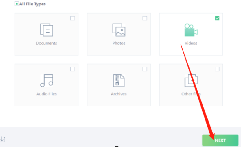 1.首先第一步我们打开软件之后是需要在界面中选择要恢复的文件类型,我们选择Videos视频文件类型之后点击右下角的下一步按钮。