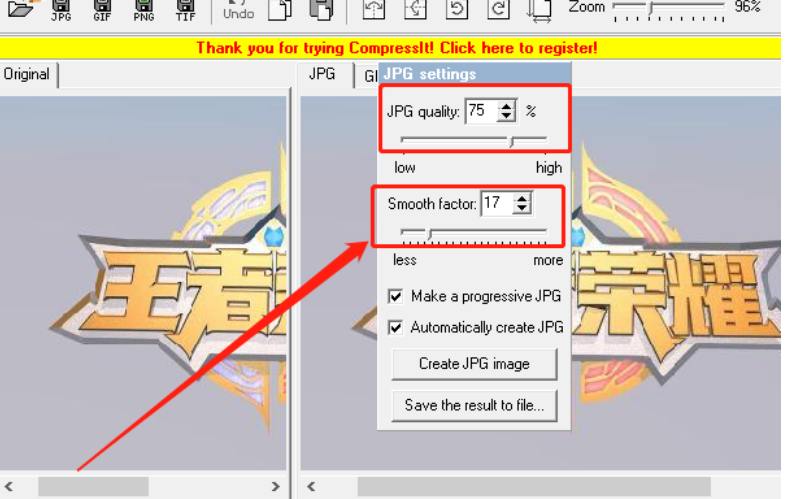 3.点击打开按钮之后图片就成功加载进来了,然后软件会自动识别图片的格式并显示该格式图像的一些压缩设置界面,用户可以自定义设置压缩图片的清晰度等参数。