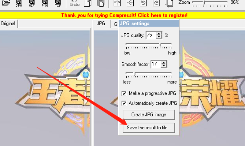 4.设置好压缩参数之后我们点击界面下方的Save the result to file这个选项即可开始压缩图像的操作。