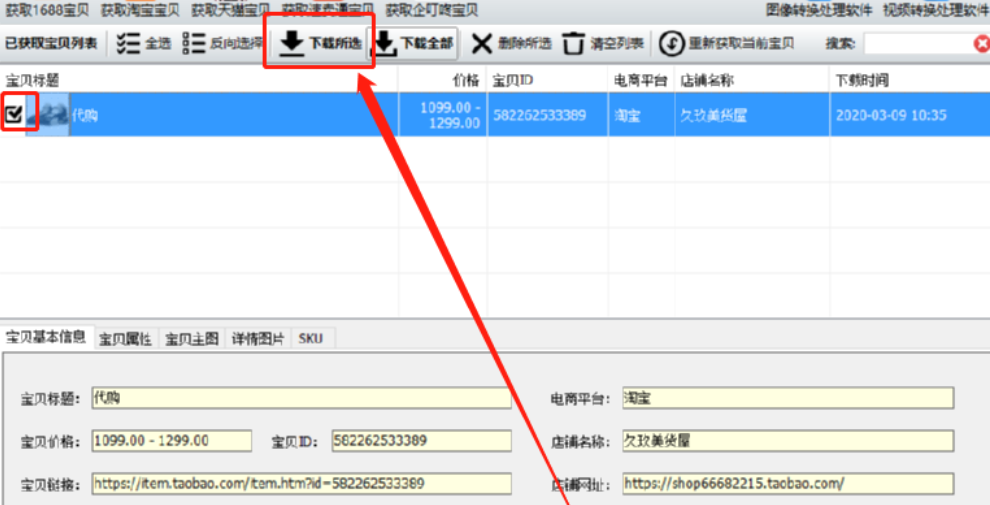 5.点击获取本页宝贝之后,下一步我们就可以在软件界面中看到选择的这个淘宝宝贝的信息了,然后我们勾选它并点击上方的下载所选按钮就可以将这个宝贝中的图片一并下载下来了。