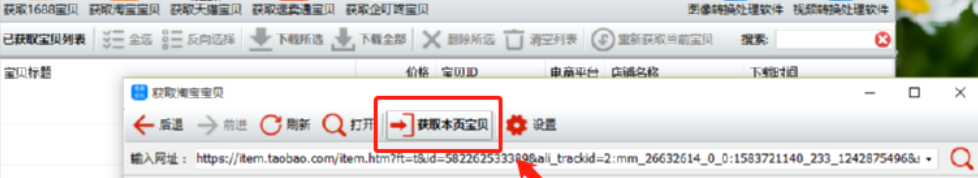 4.等到识别完成之后,我们就可以看到想要下载的淘宝宝贝界面了,然后我们点击界面上方的获取本页宝贝这个功能按钮。