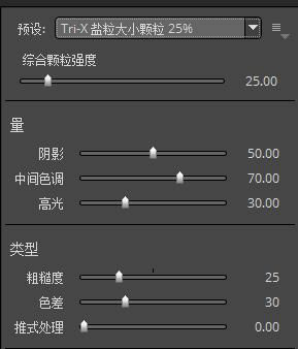 四,最后,我们可以通过颗粒效果来对照片的整体做出修饰,突出细节感,让照片的整个层次更上一个台阶,给人一种神秘的感觉。这里小编选择的是tri-X盐粒大小颗粒25%。