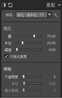 基本上我们的整体效果已经处理完成,最后一步做锐化处理。我们选择右侧工具栏的“焦距”选项,预设我们设置为“锐化-低半径-75”。注意,视频内所有的参数设置均可根据自己的图片处理,无需和视频内一样。